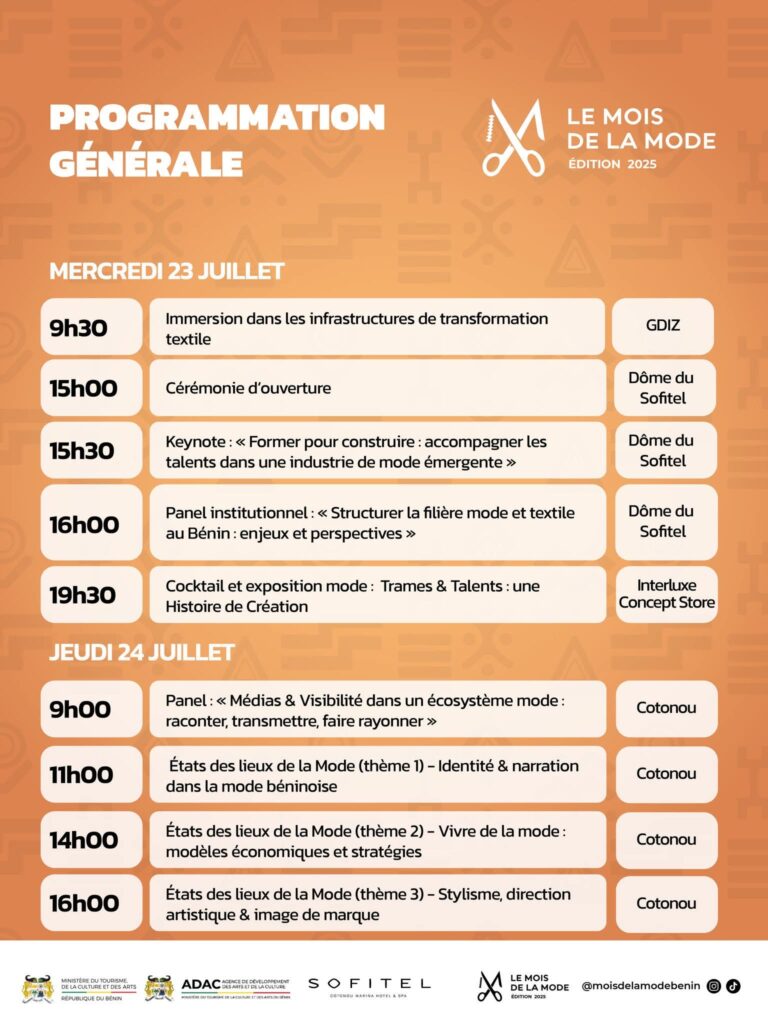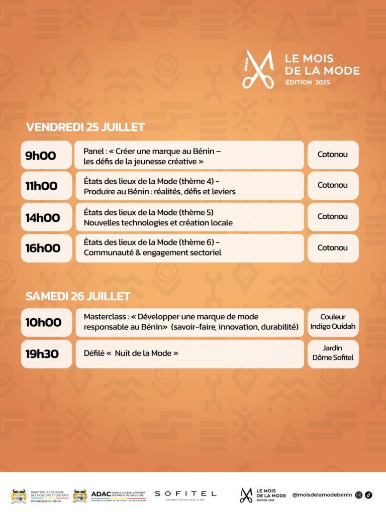 Cette édition marque un tournant décisif dans la structuration de la mode béninoise. Entre valorisation des savoir-faire locaux, réflexion autour des enjeux contemporains et mise en lumière des talents, le mois de la mode devient un catalyseur d’initiatives durables et innovantes. Au programme de cette édition 2025 : immersions professionnelles, panels thématiques, masterclass de haut niveau, expositions et défilés feront dialoguer héritage culturel et modernité créative.