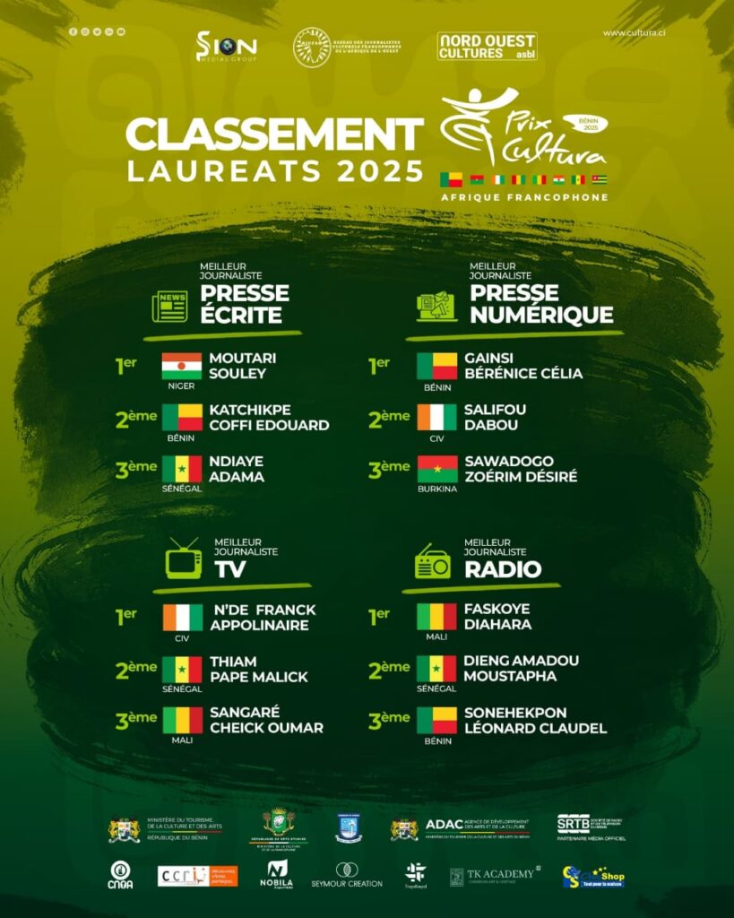 Le Prix Cultura Afrique Francophone 2025 connaît désormais ses lauréats. L’annonce officielle a été faite le vendredi 08 août dernier à la salle de conférence du Ministère du Tourisme, de la Culture et des Arts du Bénin. C’était lors d’une conférence de presse marquant une étape clé de ce prestigieux concours dédié au journalisme culturel.