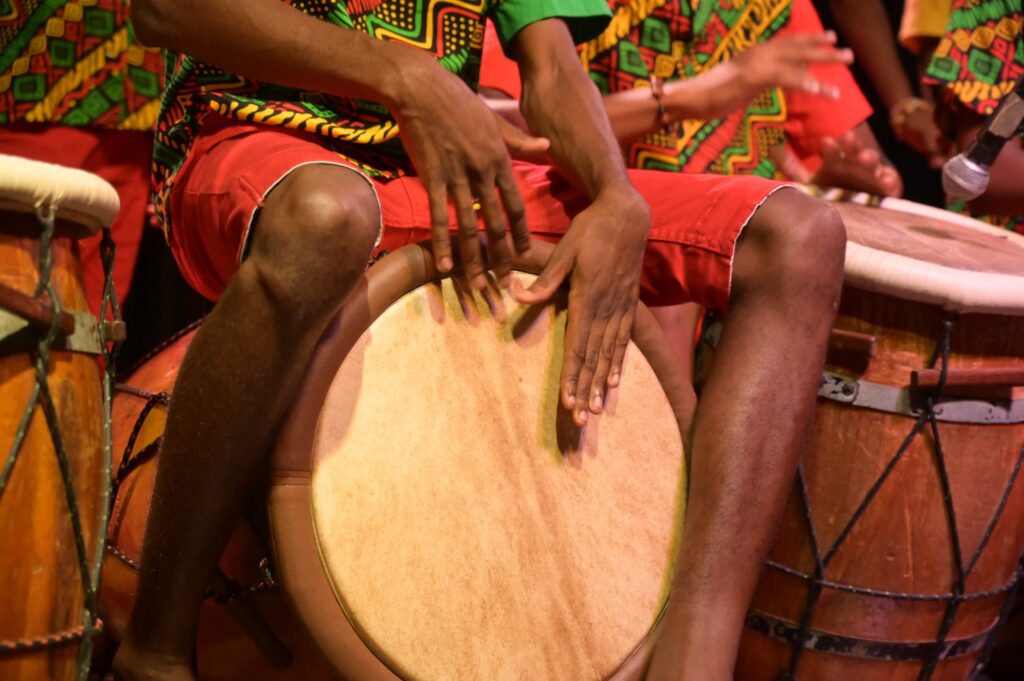 Dès les premières notes, la salle a été enveloppée par la puissance des tambours. Le Kaka béninois, avec ses résonances profondes et ses pulsations hypnotiques, s’est mêlé au Ka guadeloupéen, instrument historique né de la mémoire des esclaves. Cette combinaison a créé une harmonie singulière, où chaque battement racontait une histoire, chaque rythme portait la mémoire d’ancêtres séparés par l’océan Atlantique.